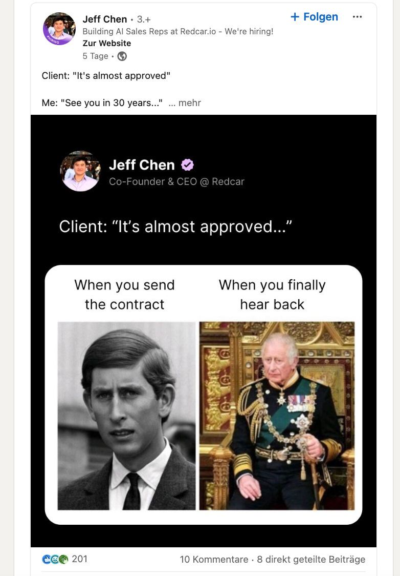 What makes this so clever is that most of these memes focus on sales—a topic that directly resonates with his startup’s audience.