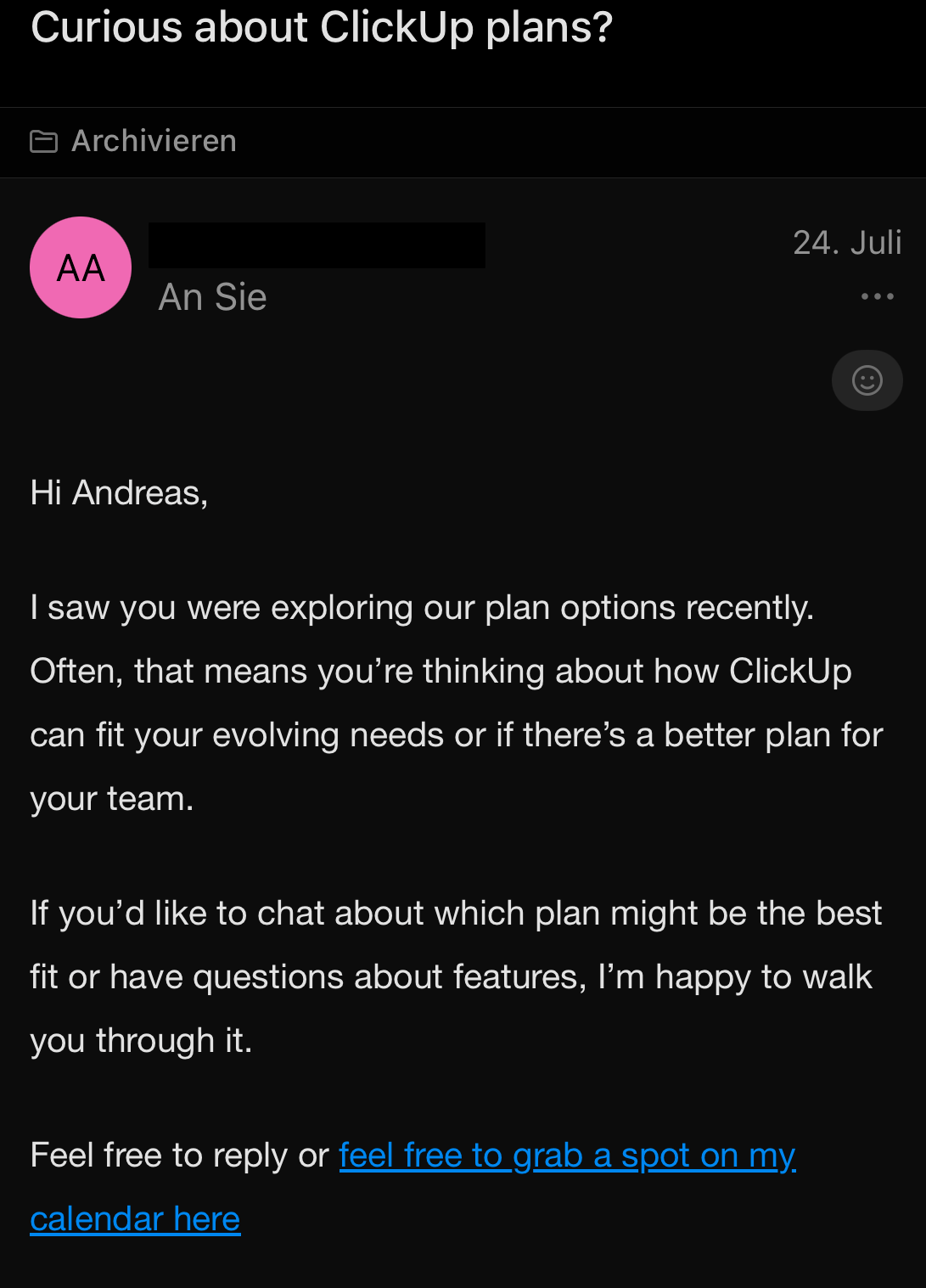 An email hits my inbox: “Curious about ClickUp plans?”